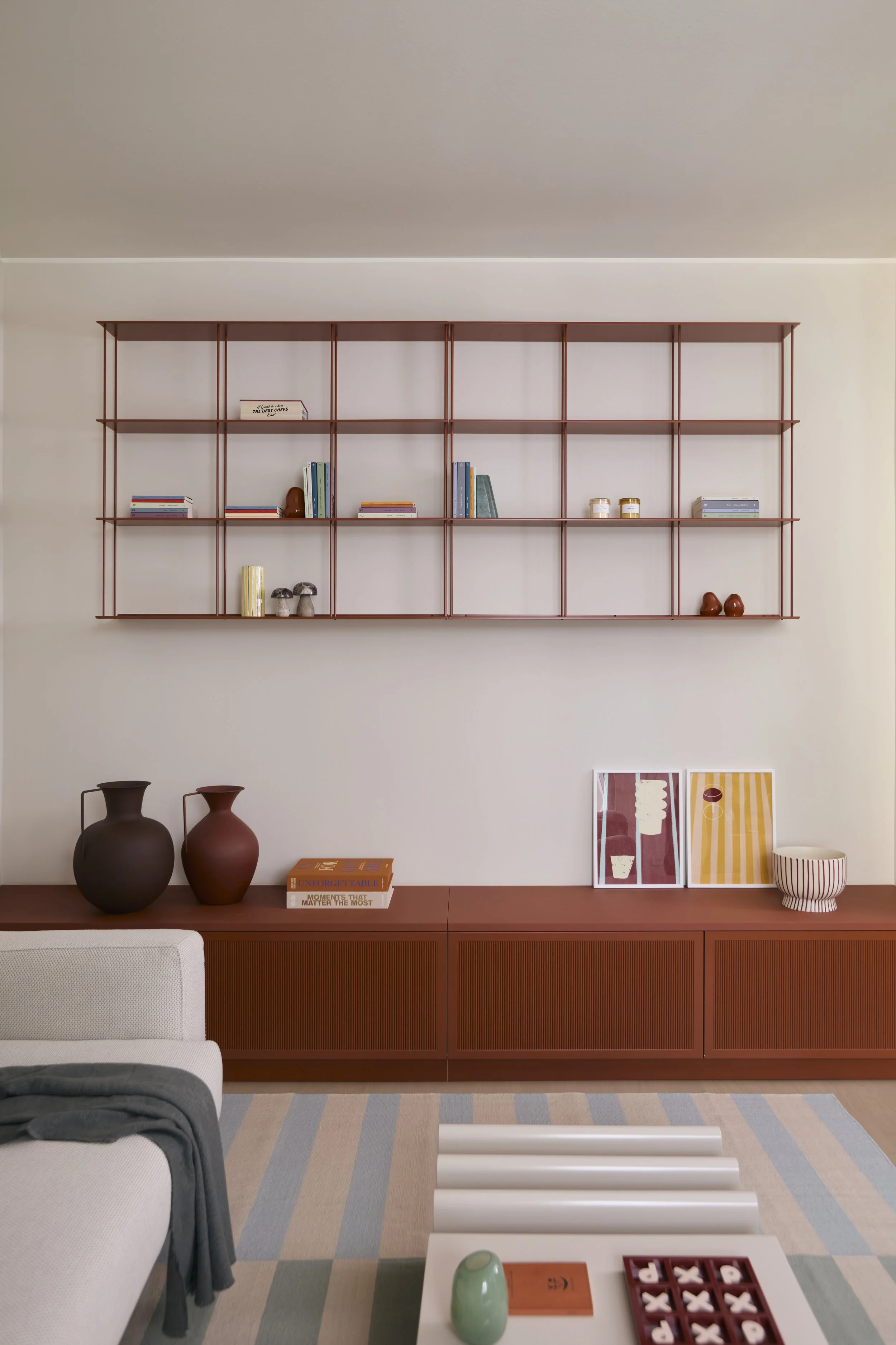 Arredi su misura e soluzioni integrate consentono di sfruttare al meglio ogni spazio disponibile, offrendo comfort, contenimento e una forte coerenza progettuale in un appartamento di dimensioni contenute.