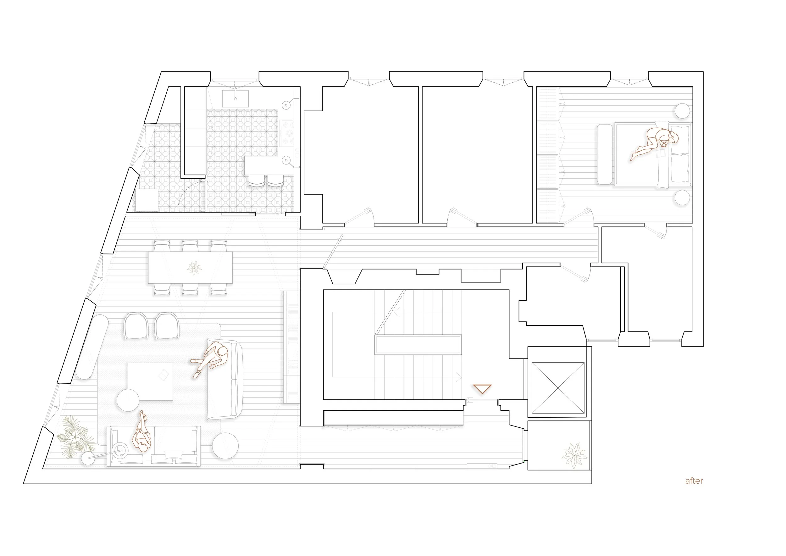 Uno spazio già abitato, alla ricerca di un carattere più definito. Il punto di svolta è una parete del soggiorno: due portali ad arco rivestiti con imbotte in noce canaletto ridisegnano lo spazio e diventano il gesto fondativo da cui si irradia l'intera visione della casa.