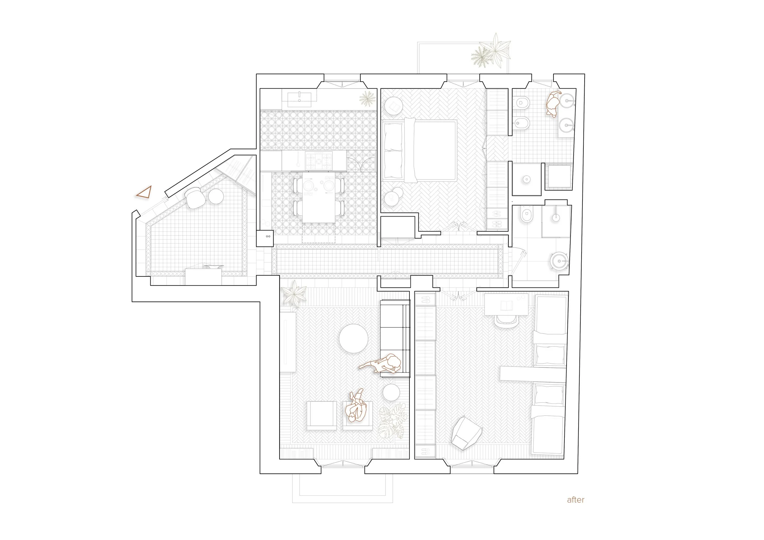 Il punto di partenza di questo progetto è il pavimento — o meglio, i pavimenti. La richiesta della famiglia era chiara: preservare i materiali originali dell'appartamento, accettando la loro storia come valore