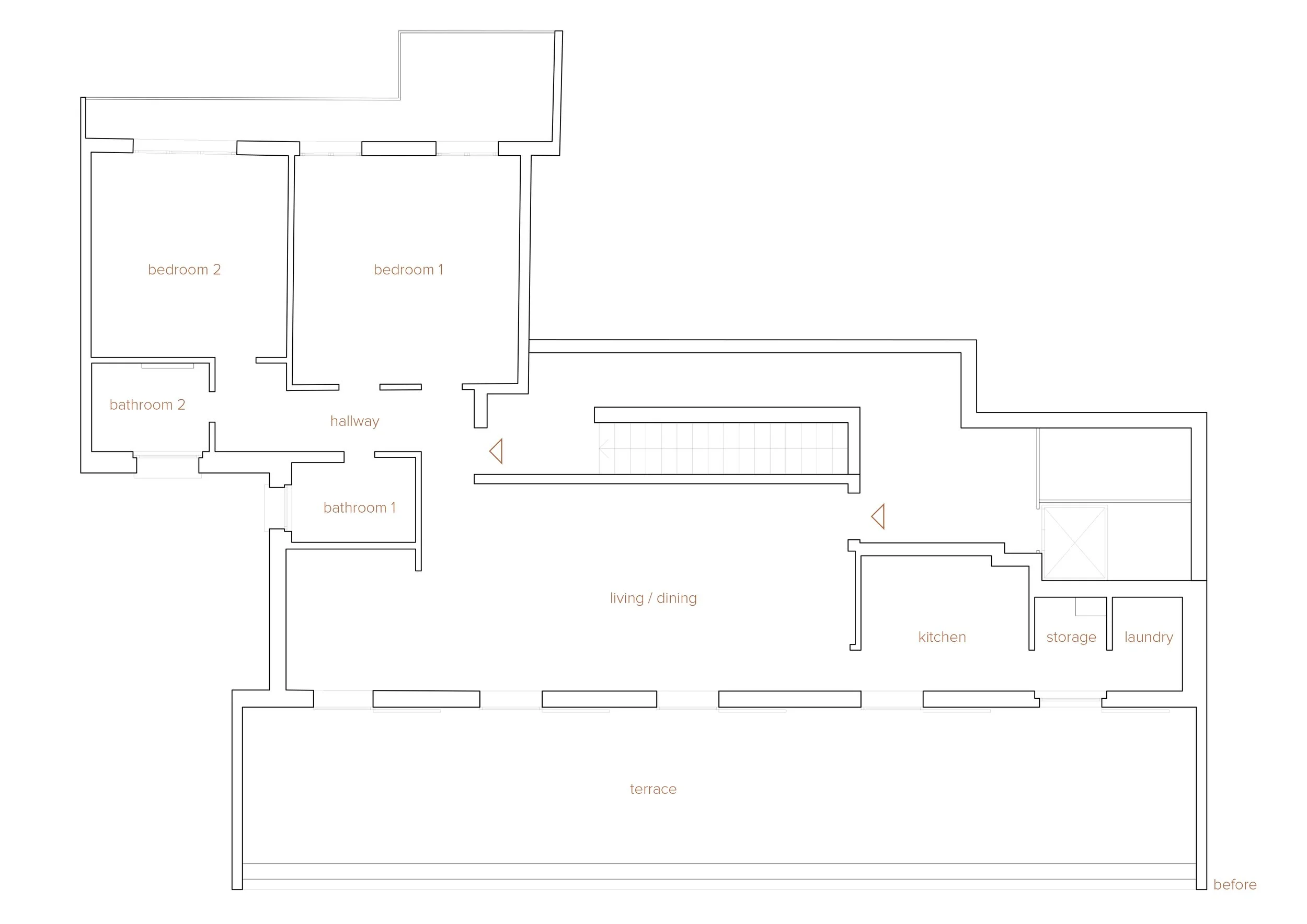 La zona living si articola in una sequenza di ambienti affacciati sul terrazzo. La quinta divisoria tra soggiorno e sala da pranzo dialoga per contrasto con la cucina verde acqua, creando un'alternanza ritmica di colori e toni neutri. La posa del parquet accompagna e amplifica questo rapporto con l'esterno: il disegno si infittisce in prossimità delle aperture e si dirada con la profondità degli ambienti, seguendo il naturale degradare della luce.