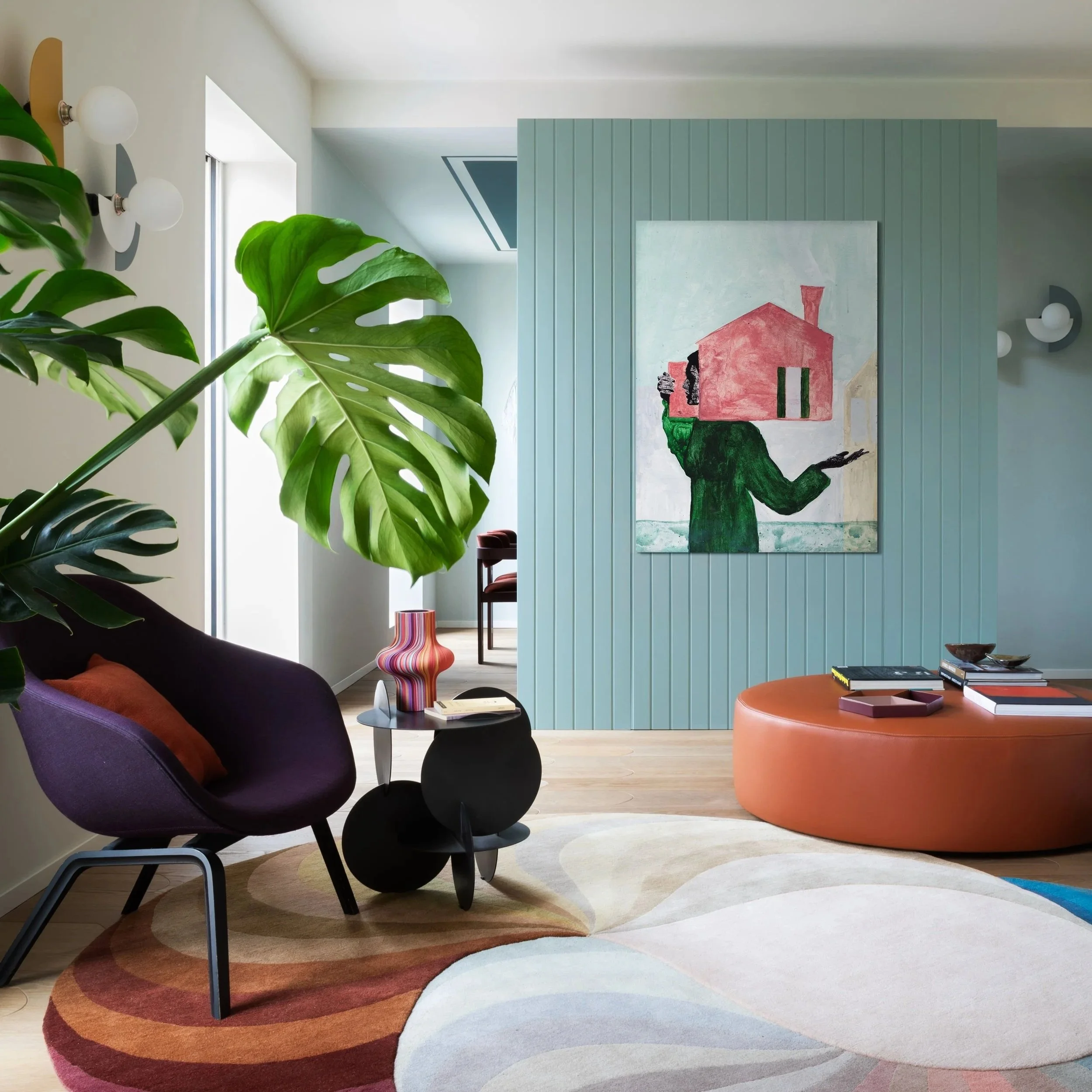 Il fulcro dell'intero schema spaziale è la "blue box": un nucleo centrale in falegnameria rivestito di boiserie cannettata, che cela le porte integrate verso gli altri ambienti e genera un senso di immersione totale nel blu profondo. Da questo spazio assoluto si diramano tutte le zone della casa, ciascuna con la propria declinazione cromatica. La palette si articola con cura sartoriale attraverso ogni stanza fino alle camere da letto, dove i colori si smorzano verso tonalità più riposanti.