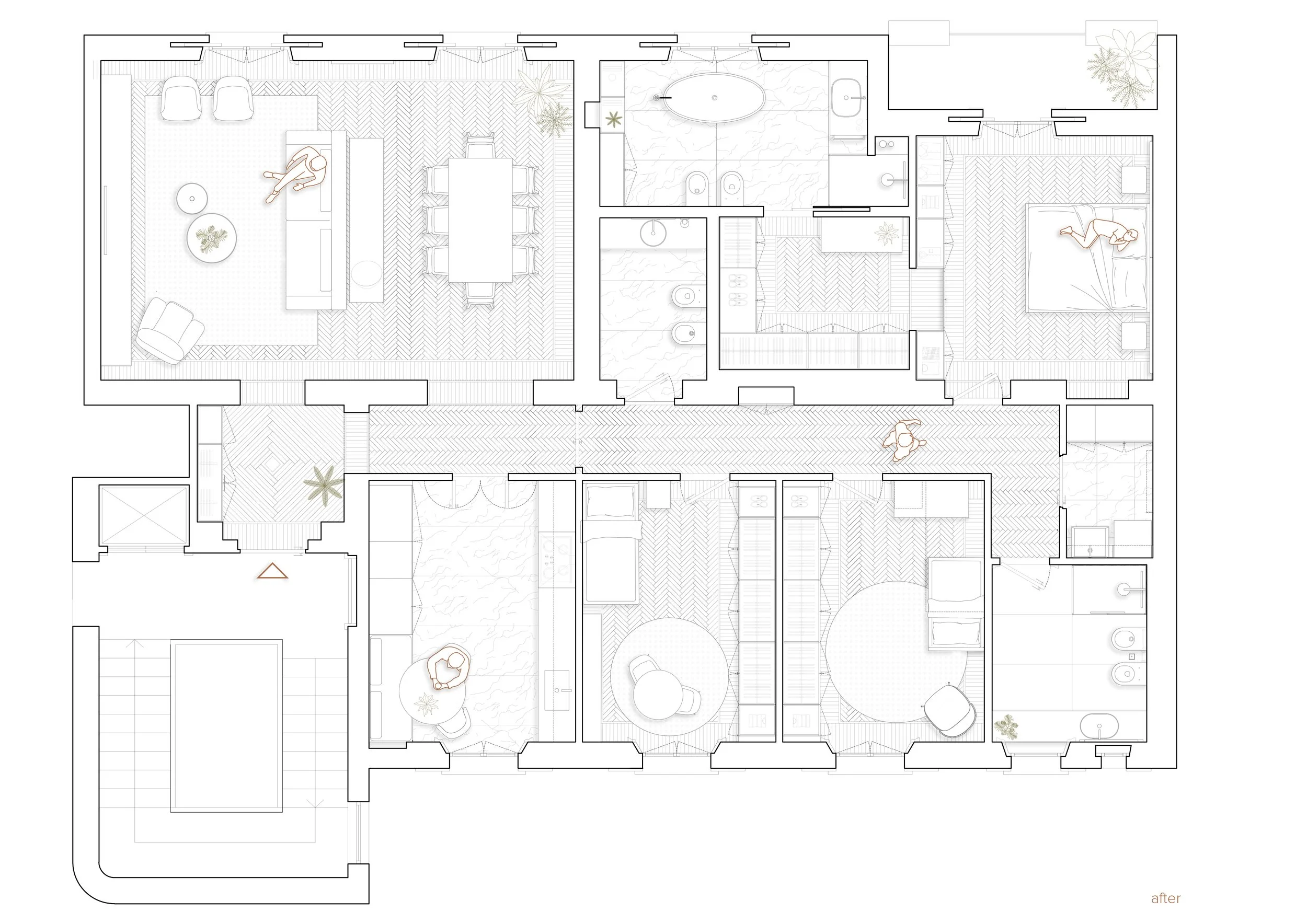I dettagli classici delle abitazioni milanesi di pregio tra cui le cornici a parete e soffitto e il disegno del parquet, scandiscono gli ambienti e restituiscono all'appartamento il suo carattere originale. A questi si contrappongono con equilibrio elementi decisamente più contemporanei: la cucina e i bagni, trattati con superfici moderne e tecnicamente sofisticate, portano il progetto nel presente senza interrompere la coerenza dell'insieme.