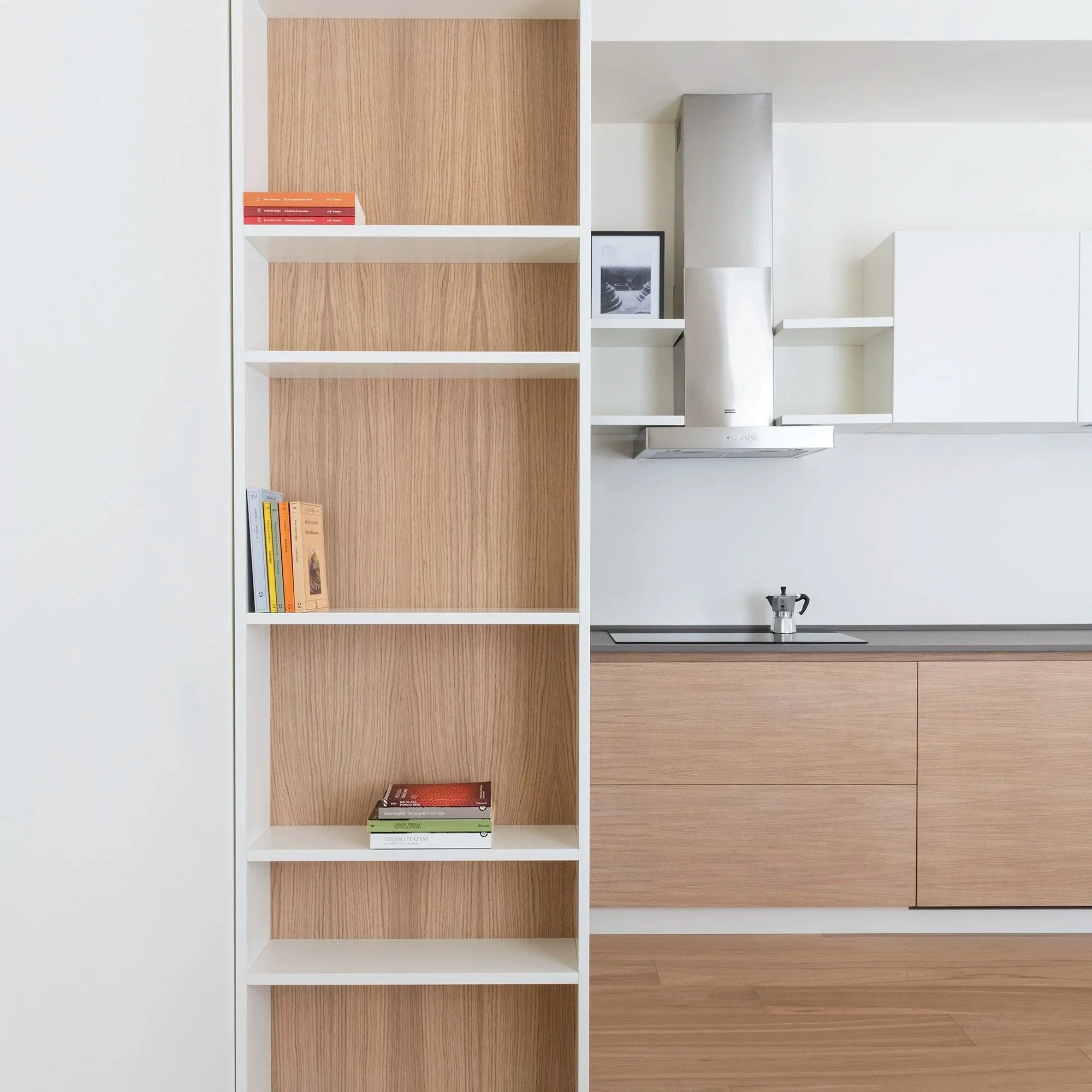 La risposta progettuale passa attraverso la scelta dei materiali caldi, neutri, capaci di dilatare la percezione degli ambienti senza appesantirli e attraverso un sistema di arredi disegnati su misura che ottimizzano ogni angolo della pianta. Nulla è lasciato al caso: ogni elemento è pensato per rispondere con precisione alle proporzioni dello spazio, integrandosi nell'architettura esistente con naturalezza.