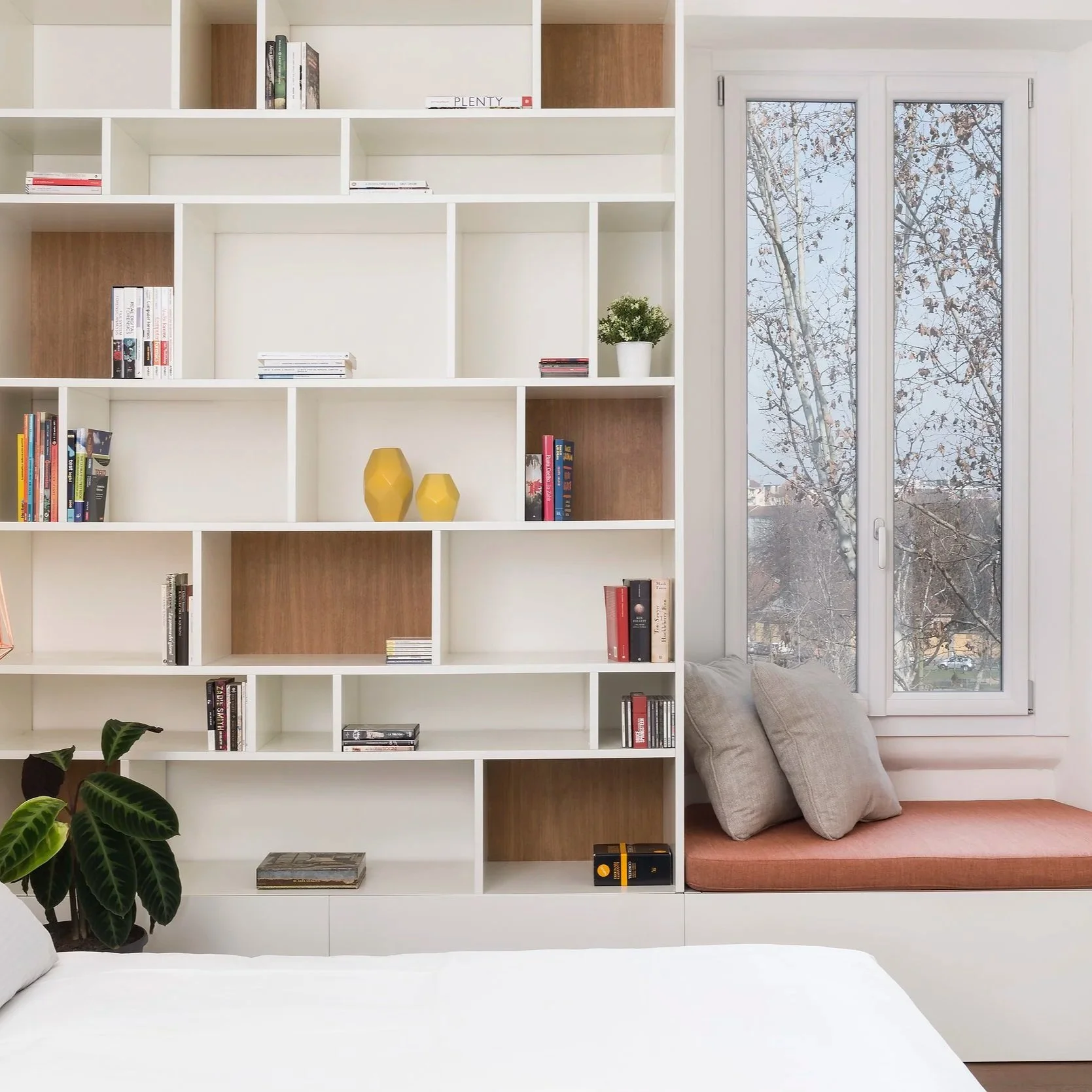 A pavimento, il legno scuro si intreccia con cementine che sfumano sui toni del verde, portando in casa la stessa varietà e irregolarità della natura. La camera da letto aggiunge un'altra dimensione: un pensatoio, panca sottofinestra abbracciata da una libreria, crea un angolo raccolto per i momenti di lettura e relax, un piccolo mondo dentro il mondo.