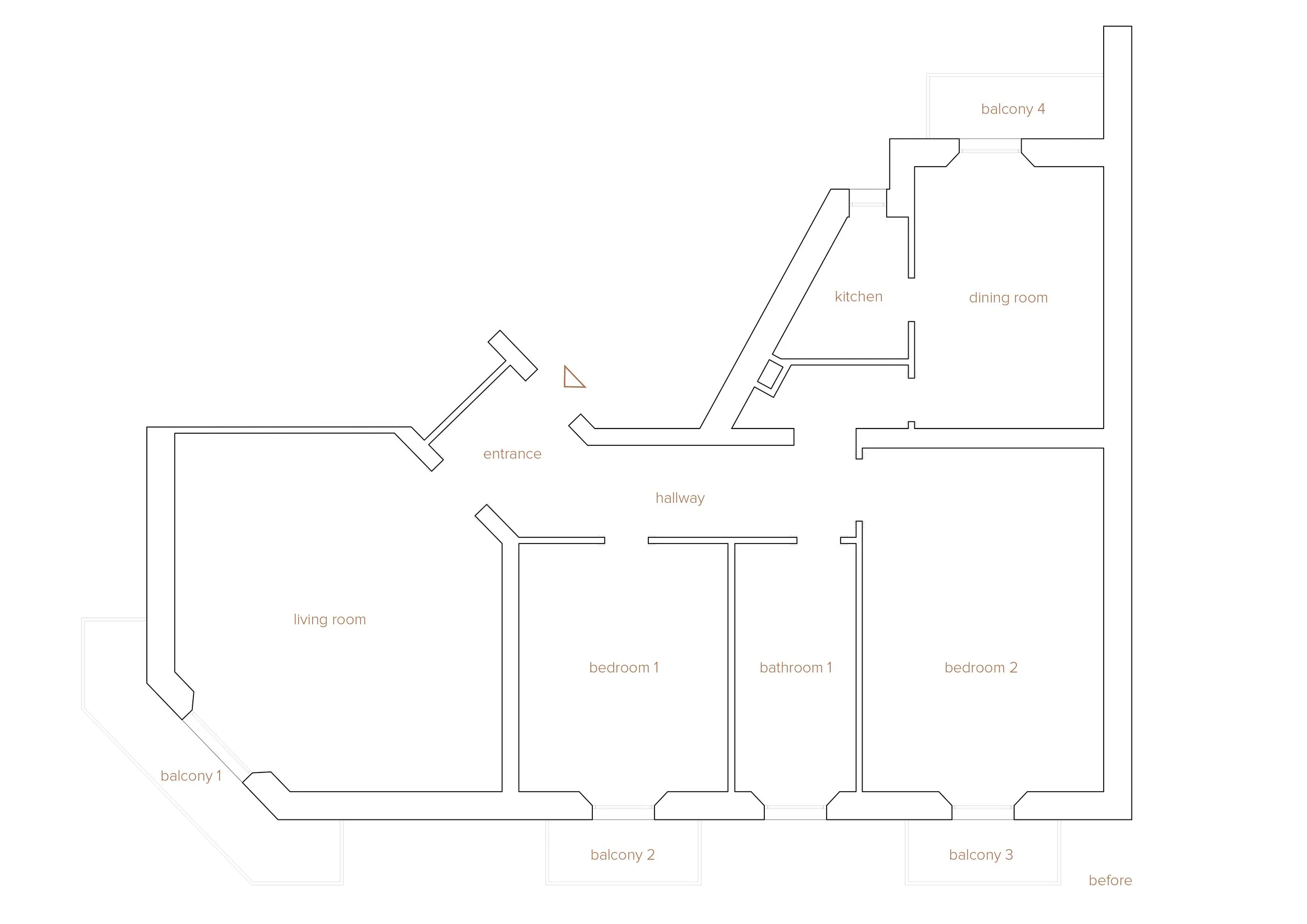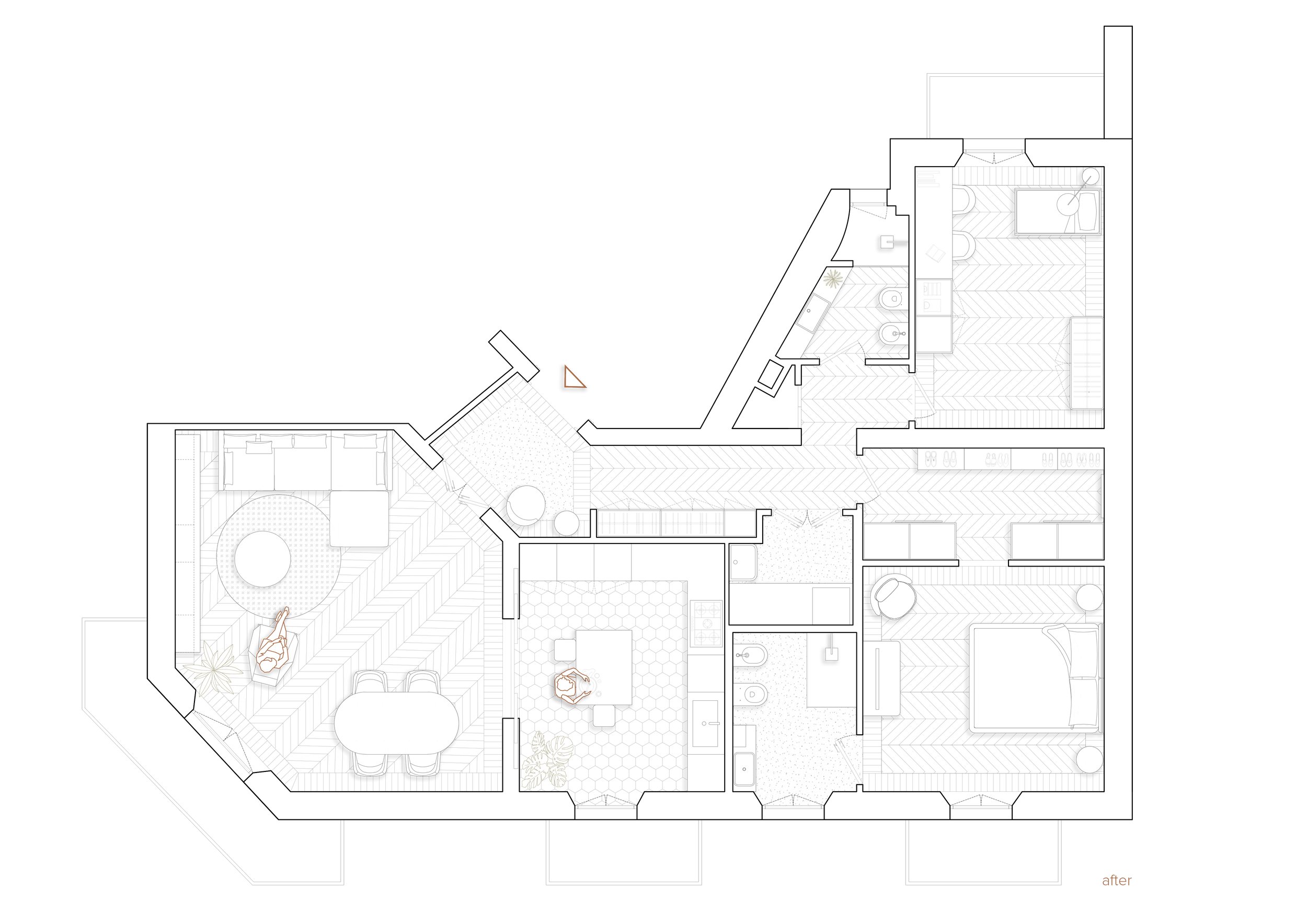 L'intervento risponde a esigenze pratiche precise: ricavare un secondo bagno, avvicinare la cucina al living secondo una concezione più contemporanea dell'abitare, e ritagliare al centro della pianta una cabina armadio passante che introduce la camera matrimoniale e un locale lavanderia indipendente. Un nuovo ordine funzionale che si inserisce con naturalezza nella struttura esistente.