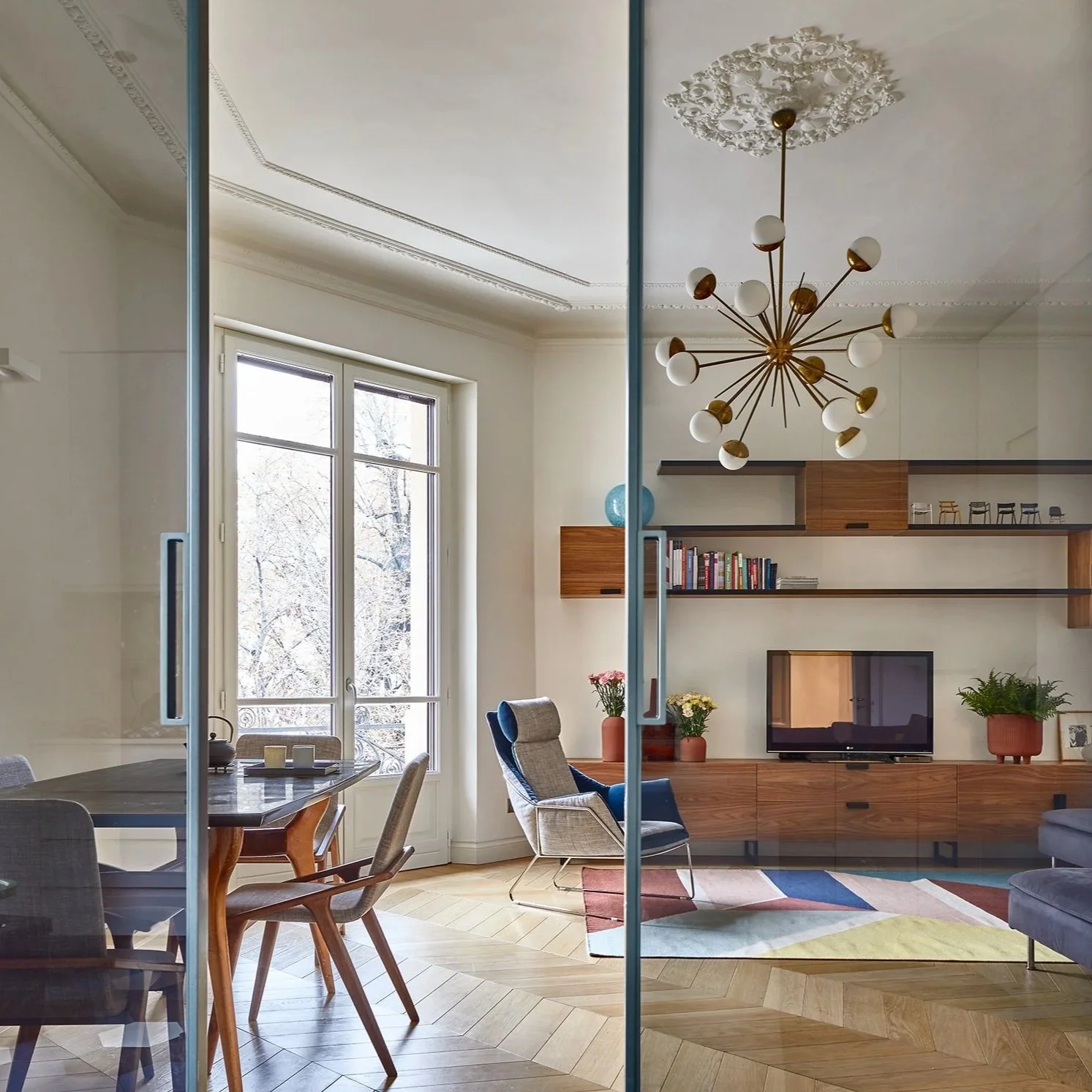 A tenere insieme passato e presente è la scelta cromatica e materica. I toni del legno e una palette di colori caldi nella zona giorno, sfumature di azzurro in cucina e nelle camere: tutto avvolto da una patina pastello e soft che non forza il dialogo tra epoche, ma lo lascia emergere con delicatezza. Un appartamento che appartiene al suo tempo senza dimenticare quello da cui viene.